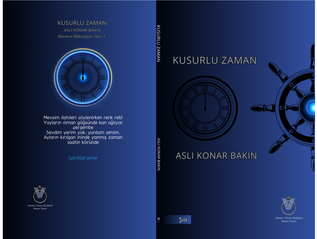 Yani hem kitap kapağımız hem de kitabımızın adı iki anlam taşır. Kusurlu zaman hem dünya saati hem de cennet saraylarının saatlerini tasvir eder. Arka kapakta ruhun artık cennet zamanın içinde olduğunu tasvir eder.